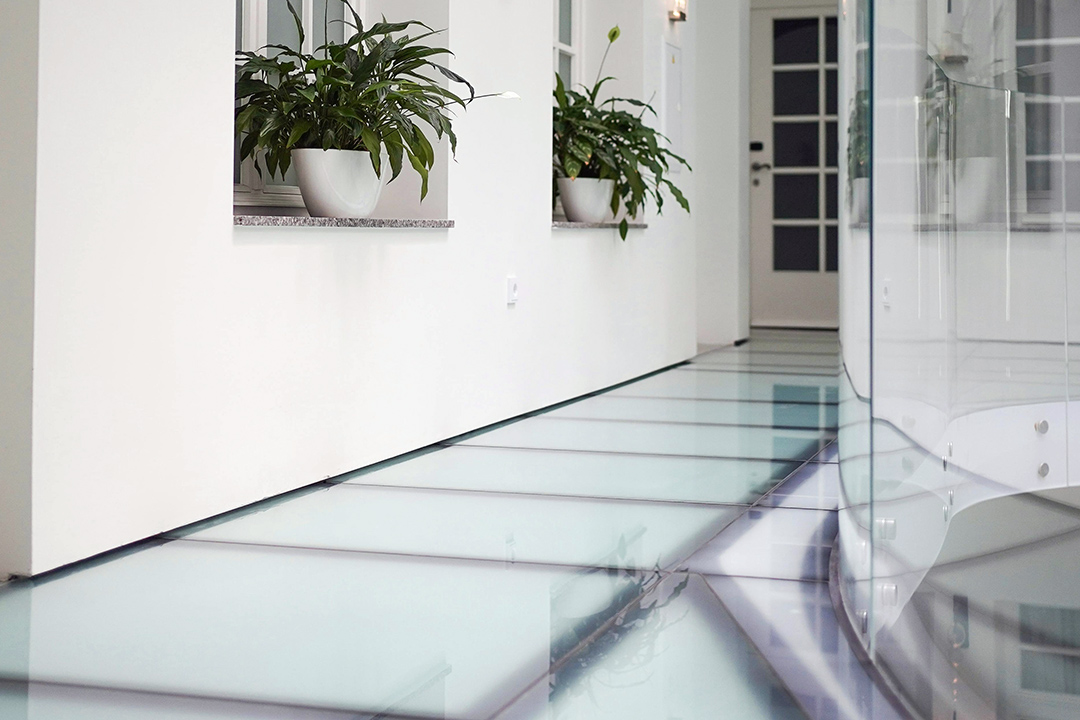 Escaleras, barandas, paredes, pisos, techos, piscinas o acuarios, mamparas, entre otros.